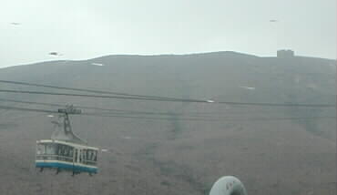 |  早々に車に逃げ込み、いよいよ阿蘇の火口を目指します。ロープウエィが動いています。 灰色の山の稜線に見えるのは、火口の避難壕です。 | |