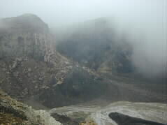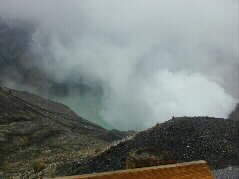 | 阿蘇山上には7つの噴火口があります。そのうちの一つ。真っ白なガスが強風でサーと消えると不気味な世界が広がっていました。 |  |