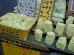 | 阿蘇でとれた天然硫黄、アトピーや皮膚病に効く温泉の素ですよ、と宣伝しています。ハングル文字でも書いてあり、安さんもフムフムと読んでました。 まわりではハングルでの話し声もしていて、韓国からの観光客も多いようです。 |  |