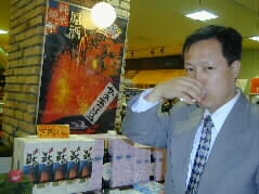 |  | おみやげ売り場を探検です。安さんは球磨焼酎の試飲をして「これはおいしい!」と韓国のお父様へのおみやげに一本買いました。 |