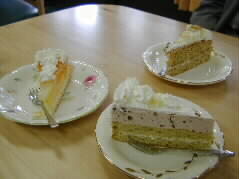 | ドイツ人の奥様の作られるケーキがとってもおいしいと評判のお店です。3人で夫々別のケーキを食べました。甘味控えてそれでいてコクのあるおいしいケーキ。 左からフルーツのケーキ、小豆ムースのケーキ、ナッツケーキです。 |  |