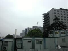 向き合って建っているプレハブは工事関係の建築事務所です。間の道路は24時間警備の警官が立っています。 |