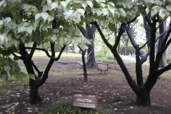 | 参議院議場、赤絨毯の廊下、中央広間、御休所などを見学して、正面前庭の「都道府県の木」の植えられている所へやってきました。ここで、大分県の豊後梅を見つけました。 | |