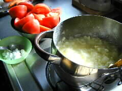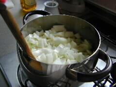 |  | 湯布院の友達からもらった玉ねぎは1センチくらいの大きなミジンに切ります。 お鍋にオリーブオイルを入れてニンニクを炒め、玉ねぎを入れてゆっくりと弱火で煮るような感じで時々混ぜながら炒めます。 |