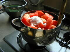 |  | そこへトマトと塩を入れました。お鍋に山盛り、大丈夫かな?と思いましたが、煮込むうちに、、、、 |