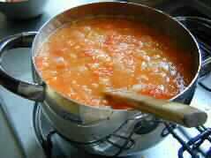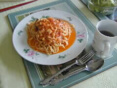|  | そして昼食は早速、このトマトソースを使ったパスタにしました。 爽やかなトマトソースがとってもおいしかった。今日のソースはツナと大豆を入れてシシトウでピリリとさせました。(Linguine al tonno rosso) |