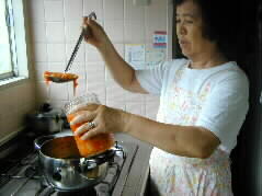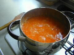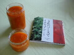 | 部屋中、いえいえ家中がトマトの甘酸っぱい香りで満ちています。何か作るとき、家中にその香りが満ちるのが私は大好きです。 さめたので保存ビンに入れます。 |  |