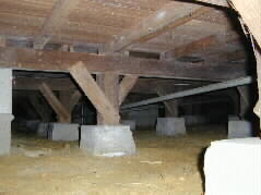 | 我が家の床下です。比較的きれいな状態が保たれているようですが、南側の土台の側の土が少し湿気を帯びています。これを何とかしたいと換気扇をつけることになりました。 | |