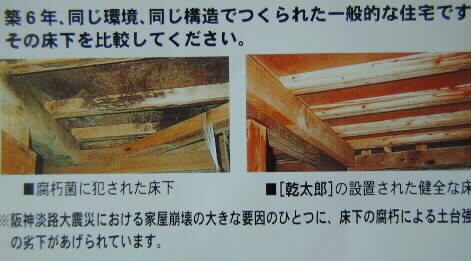|  | 建築後30年近く経った我が家は9年前にリフォームをしましたが、広いテラスを作ったことで、床下の喚起が悪くなりました。床板の一部張り替えをしましたがシロアリ防止のためにも床下の湿気対策が必要になりました。 |