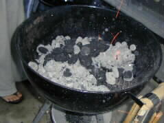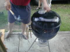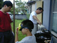 | 炭は昨日、福岡のコスコトで買ってきたチャコール。そしてオーブンは数年前、宮瀬さんご一家がアメリカ旅行のおみやげに担いで帰ってきたものです。 ゆうり君は煙が目にしみるので、水中眼鏡をかけてお手伝い。 |  |