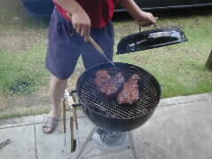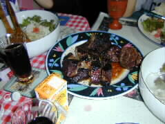 | お肉ももちろん昨日、コスコトで買って来たUSビーフの大きな塊、それをとも子さんが、おいしく漬け込んで下さっていたものです。あたりはお肉の焼けるおいしい匂いで一杯です。 | |