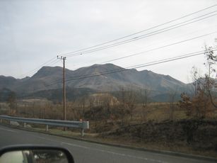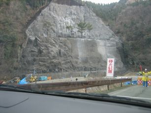 | 城山展望台から阿蘇盆地へくねくねの急坂を下ります。途中で崖の大工事をしていました。 |  |