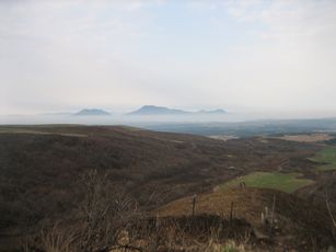 | 大分県と熊本県の県境あたりから見た阿蘇五岳、寝釈迦像ともいいます。雲海に浮かんでいます。  手前の丘陵地が黒いのは野焼きをしたからです。 |  |