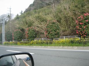| 国道57号線をj熊本へ向けて走ります。道路と平行してJR豊肥線が走っています。線路沿いは菜の花がいっぱいです。椿も並んで咲いています。 |  |