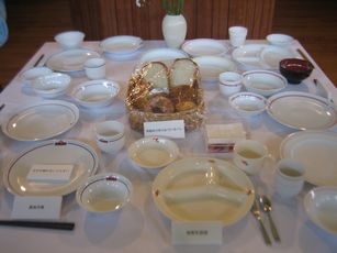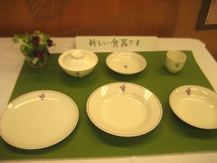| The set of new tableware was prepared in commemoration of the remodeling of National GOF house. The dish was of the design of violet grape bunch. On the back of the dish was a character "Friend" in the Founder Motoko Hani's own handwriting copy. The character was taken from the title of Group of Friends newspaper, they say. | ![]() |