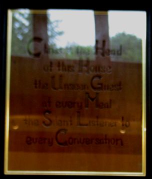The founders' commemoration room. There were pictures of the founders and their principle phrase tablet "Thinking, Living and Praying." |