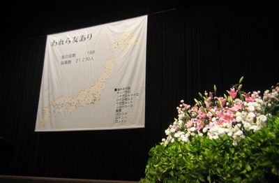 ![]() On the front wall of the stage was a flag that reads "We are the friends" on the map of Japan. There are 180 domestic branches and 9 overseas branches. |