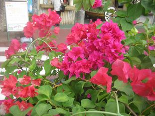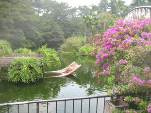 池には鯉が泳ぎ、モンステラで飾ったボートが浮かブーゲンビリアが咲き誇る。 |