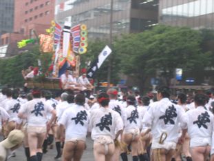 | 無事に福岡空港へ帰ってきました。地下鉄で博多駅に来たら、駅前が大勢の人垣が出来ていた、何事かと思ったら、博多祇園山笠の追い山慣らしでした。初めて目の前で見て思わずカメラ構えました。 | ![]() |