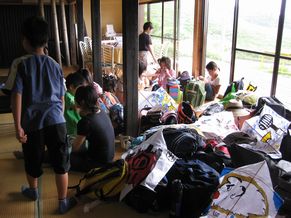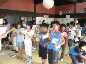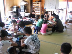 | 全体の集まりです。学園生のリーダー井田さんと一緒に羽仁もと子著作集「子ども読本」から「敵をも愛す」を読書して感想を話し合いました。その後、子どもも大人も三日間の感想を報告。その後、子どもたちは班毎に別れて、感想文を書きました。 |  |