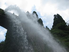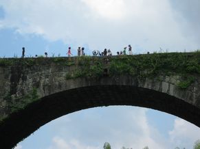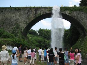|  | 暑かったのですが、放水のしぶきを浴びて、随分涼しくなりました。昔の人が、水のない所へ水を運ぶために作った石の橋です。今もこんな感動を私たちに与えてくれます。 |
