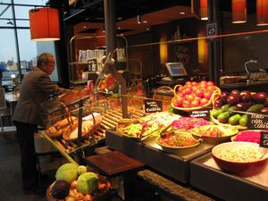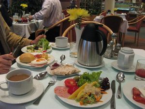 朝食です。このホテルはとても色彩の美しい食事をいただくことが出来てうれしいです。アルミのポットはコーヒーが、その右の白いふたつきサーバーにはミルクが入っています。 |