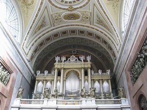 | 荘厳な聖堂内部です。左は、正面祭壇に掛かる世界最大級の油絵「聖母マリアの被昇天」。 右はパイプオルガンです。音色を聞いてみたいです。 |