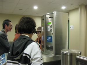 | トイレ休憩に立ち寄ったパーキングエリアです。トイレは有料でした。ツアーの皆で珍しいのと、どうするの?ということで、コイン投入ボックスを眺めています。 | ![]() |