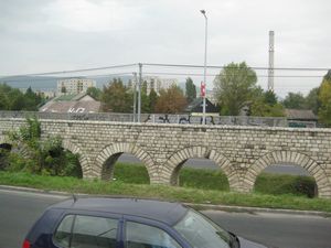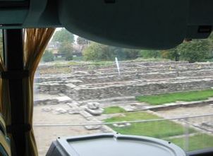 食後にホテルが停電というハプニングもありましたが、何とか無事にホテルを出て次の目的地へ向うことが出来ました。8時40分出発。黄葉の木々を眺めながらバスの旅です。 途中、ローマ時代の遺跡が見えてきました。アクイツムです。水道橋があったり兵士の住居跡がの遺跡など。 |
