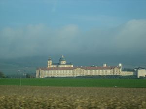 | ひたすら草原、農場の高速道路を走ります。時折教会の尖塔が見えると集落があります。 そこで、ひときわ目を惹くお城のような建物、ヴァッハウ渓谷という美しい景勝地に建つ「メルクの僧院」だそうです。 |