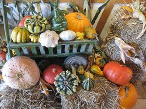 休憩に立ち寄ったパーキングの入り口に飾られていたカボチャです。様々な形をしていますね。 |