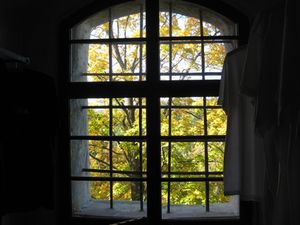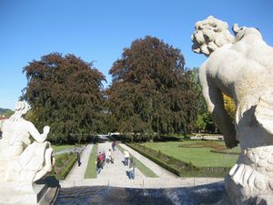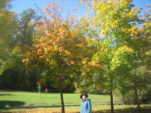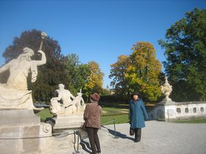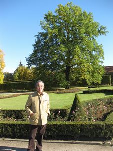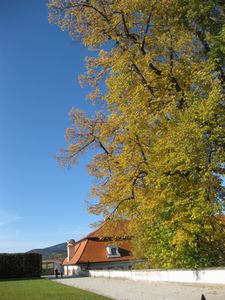 今度はお城の庭園に来ました。大きな木々が色づいて美しいです。大きな黄葉した木は菩提樹です。 |