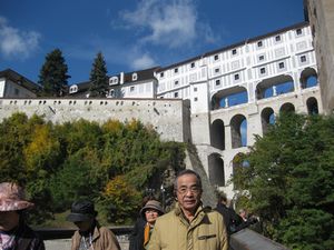 ウィーンから270キロ走って着いた街は、チェコの世界遺産の町「チェスキー・クルムロフです。 チェスキーは、チェコ語で「ボヘミアの」という意味、クルムロフは「川の湾曲部の湿地帯」を意味するとか。後で地図を見て本当に納得しました。 |