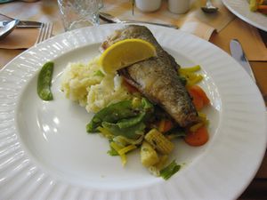 スヴォルノスティ広場の一角のレストランで昼食です。スープ、マスのバター焼き、ポテト添えです。 おいしいマスでした。 |