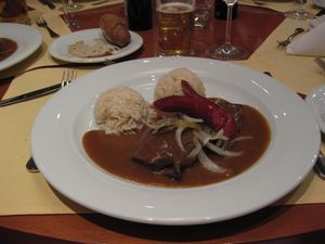 | プラハに入り、レストランで夕食、ソーセージとジャガイモです。ソースが良い味でした。 今日はさすがに疲れました。 |