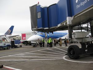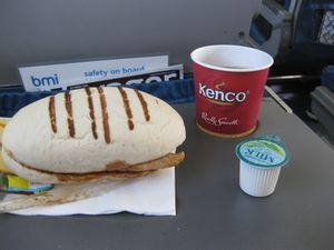 | 何だか少々頼りない感じですが、10時05分発ブリティッシュ・ミッドランド航空のエジンバラ行きです。着10時45分、40分間のフライト?の訳ないよね、と思っていたら、時差が1時間。飛行時間は1時間40分ということ。ちゃんとランチが出ました。 | ![]() |