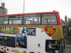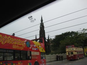 バスがたくさん走っています。エジンバラの中心部に着きました。向かい側には、観光二階建てバスが次々ときて止まります。 |