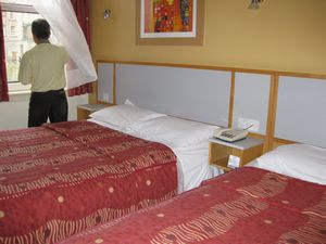 | 日がかげるとスーと寒くなりました。手がかじかんで来ます。ホテルへ帰ろうと急ぎました。ホテルはキーカードを差し込まないと、エレベーターも動きません。ホテルのレストランで、夕食にしました。隣りのパブからは元気の良い人々の声が聞こえました。 | |
