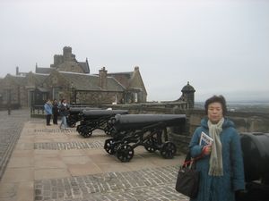 | 更に前方には北海を望む。場内にはこのような大砲が設置されている。中には15世紀、北側にむけ6トンもの巨大な大砲が設置されていた。150キロの砲丸が使われ、メアリー1世とフランス王太子フランソワ(のちの"フランソワ2世 (フランス王)"フランソワ2世)との結婚を祝い1558年に打ち上げられた | ![]() |