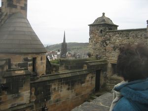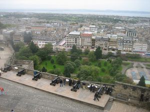 城壁越しに、エジンバラの町とホーリードール(英王室のスコットランドの宮殿)の丘が見える。 |