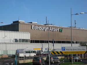 | お天気は、何となくスコットランドのイメージのするどんよりと曇ったお天気。 これは、帰る日に写したので青空です。エジンバラ空港。 |