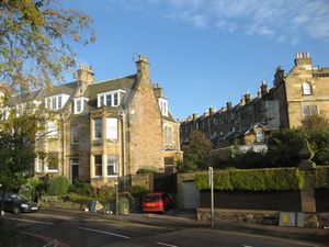 | いよいよエディンバラともお別れです。ホテルのまん前にバス停があって、タクシーを呼ぶことなく、空港へ行くことが出来ました。 同じタイプの部屋が並ぶ、タウンハウスです。屋根にはチムニーが一杯見えます。煙突の数だけ、部屋数があるとか? |
