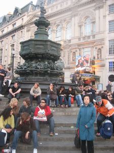| そこはピカデリーサーカスでした。余りの人の多さに呆然! ここからのびるたくさんの道、有名ブランド店が並んでいる、ウィンドウショッピングに最適。 明日の観光バスの出発地点の三越を確認して帰る。 |