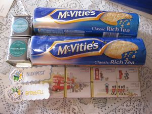 | 10月19日 今回のおみやげは、ロンドンで買いました。写真を写すのも忘れていて、気付いた時は、これだけに・・・・ ティータイムに、ビスケットとチョコ板がお気に入り。このMcvitiesのRich Tea とっても素朴でおいしいです。紅茶友達が、これでなくちゃよ、とアドバイスしてくれて、でも、探し回って買いました。 |
