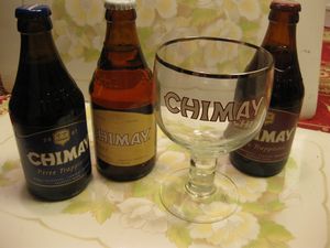 トラピスト修道院製のビール「CHIMAY」白、赤、青と専用のグラス。 |