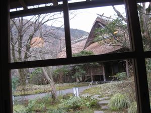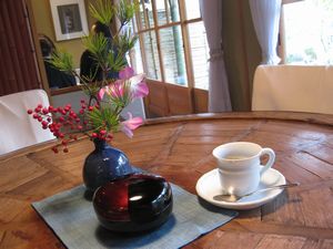| おいしいコーヒーを頂きながら、窓の外へ目をやると、冬枯れの庭と、雪雲を被った由布岳。冬のリンとした佇まいのお宿です。 | ![]() |