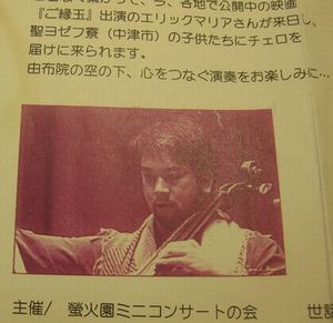 そして、五円玉を握り締めて、エリックマリアさんが、大分へやってきた。チェロで、痛みの山田さんにセラピーを施す。 山田さん亡き後も、その交流を描いた映画「ご縁玉」と共に、「いのちの大切さ」をチェロの響きを通して伝えているエリックマリアさんです。 |