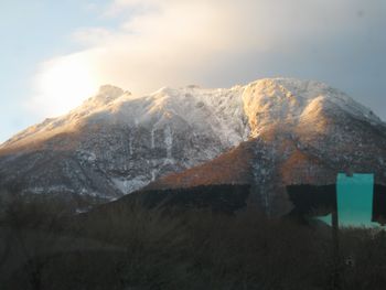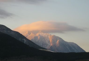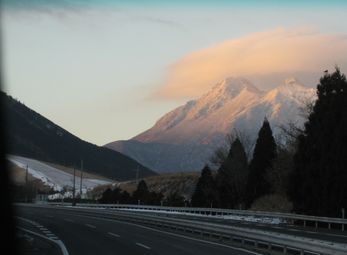 |  | 朝、7時31分、太陽の光が雲と雪肌に当たって、とても美しい姿になっている由布岳です。 |