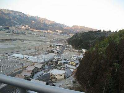 | 山々に囲まれた田んぼと集落も、雪がうっすらと積もっています。 |  |