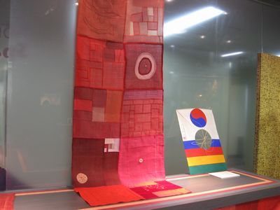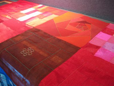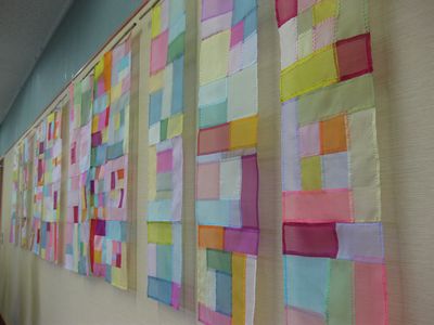 | 友の会の会議を終えて、韓国観光公社福岡支社に「第3回日韓友情のポシャギ展」を見にきました。日韓国交正常化40周年を記念して2005年に始められて日韓友情のポシャギ展が今年も開かれました。小さなはぎれも大切にする心、家族への愛の篭められた韓国の手仕事文化であるポシャギは、日本人にも愛好者が増えています。日韓の有志が作ったポシャギを繋ぎ合わせて、大きなポシャギに仕立てました。第二回の様子はこちらです。 | |
